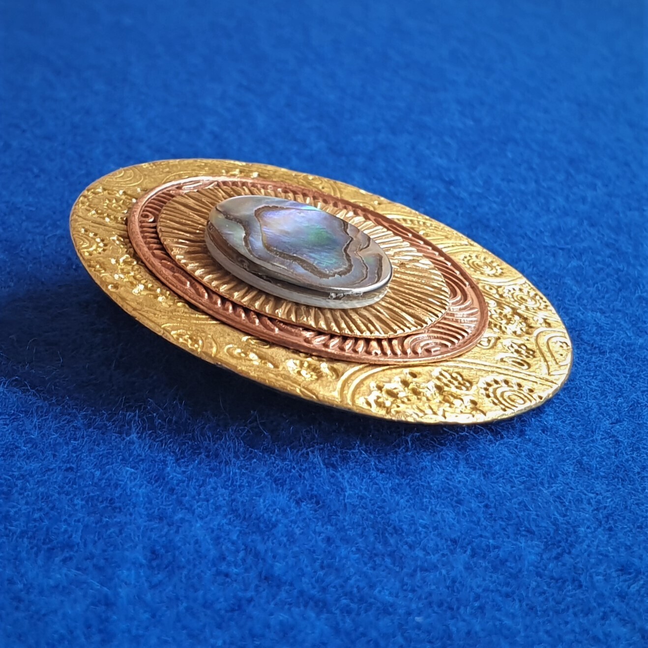Broche en laiton doré, cuivre et bronze à triple motif, « cachemire », cercles concentriques et radial, avec coquille d’ormeau naturelle (nacre).